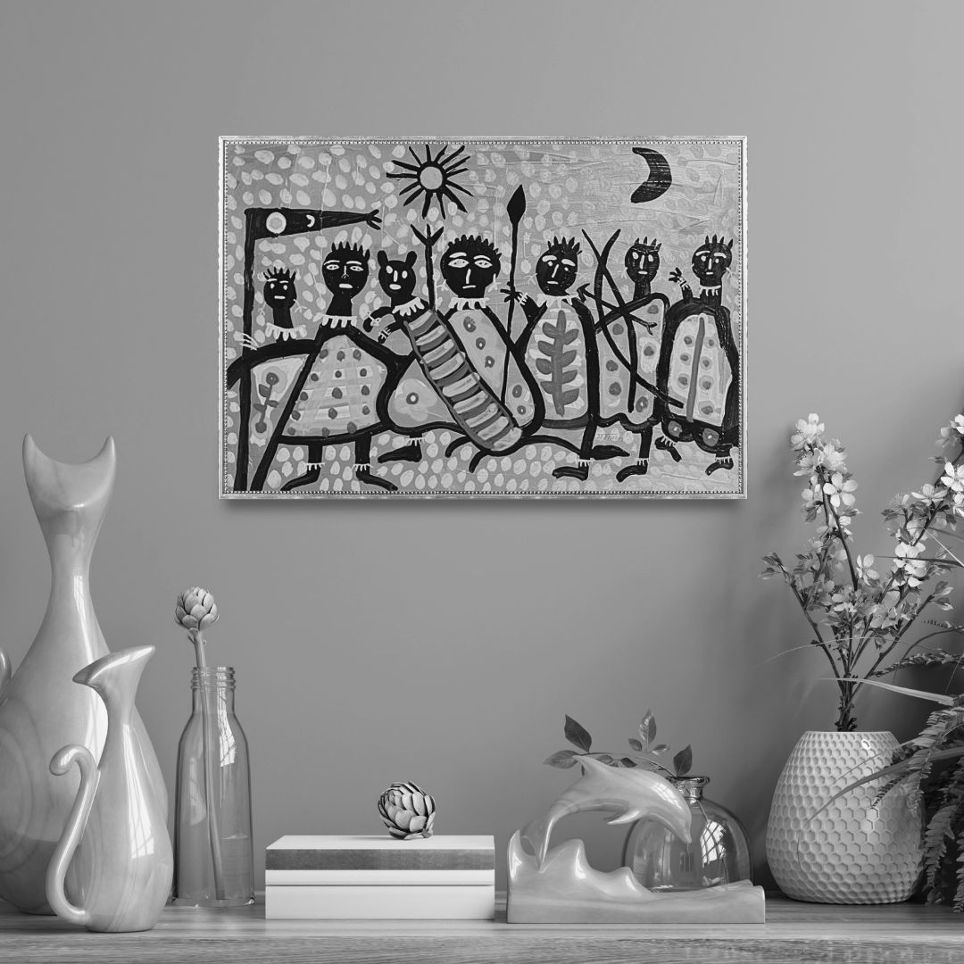 The composition unfolds as a carefully balanced field of interlocking forms, each shape defined by confident contour and filled with intricate, rhythmic patterning. Figures and motifs—whether human, animal or vegetal—are rendered with stylised clarity, their interiors animated by repeated marks that create density without heaviness. The eye moves steadily across the surface, guided by repetition and variation rather than narrative sequence.