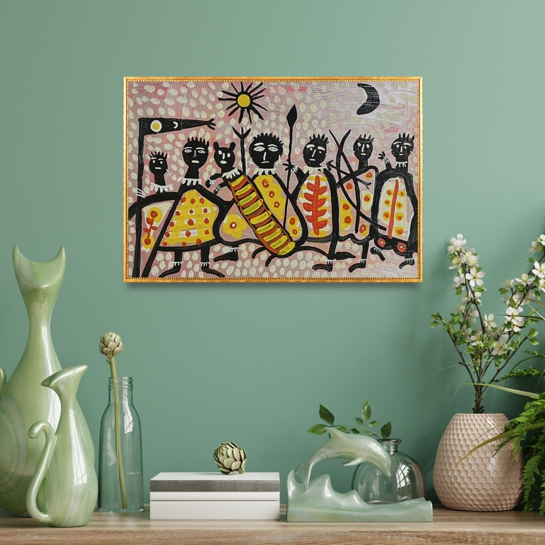 Colour is applied in flat, assertive planes that heighten the decorative force of the image while maintaining structural control. Pattern does not overwhelm form; instead, it reinforces it, giving each body a contained energy that feels deliberate and composed. Open areas of ground create breathing space between concentrated passages of detail, ensuring that the overall composition retains cohesion and visual clarity.