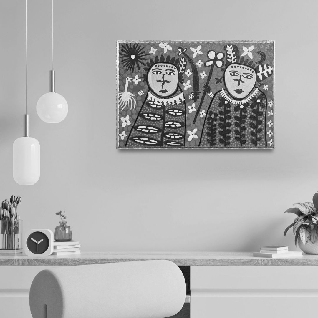 Colour is applied with confidence and clarity, flat yet luminous, allowing the patterned interiors to carry the visual weight. The absence of conventional depth keeps the viewer close to the surface, attentive to the dialogue between filled form and open ground. Negative space is neither empty nor incidental; it functions as a pause between passages of intensity, sharpening the impact of each meticulously rendered shape.