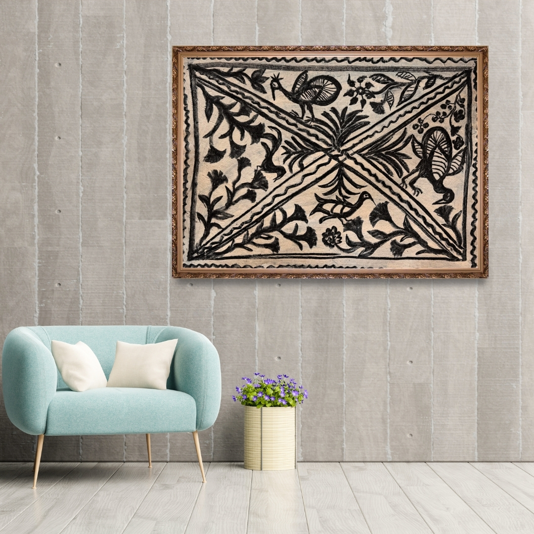 Executed in natural black pigment on handmade paper, the artwork embodies the quiet elegance of traditional mural design. Anita Devi’s masterful linework conveys motion and stillness in equal measure, as if the jungle itself is breathing. Her work captures not only the external beauty of nature but also its inner pulse, where each curve and contour resonates with ancestral memory and balance.