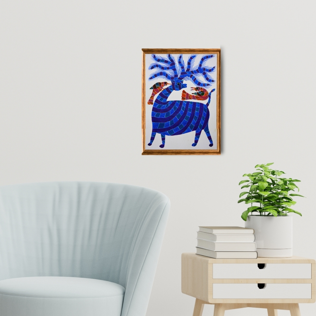 This colorful tribal painting features a fantastical blue deer-like creature with impressive, leaf-shaped antlers that seem to move and glow. Its body is covered in a mix of patterned dots and stripes in shades of blue, red, and green, giving it a lively texture. Two stylized birds sit on the creature—one gently pecking at its neck, while the other appears to be having a close conversation near its face. The image highlights themes of friendship, harmony, and magical communication in the forest, showcasing the Bhil tradition’s deep bond with nature and its rich spiritual storytelling through detailed patterns.