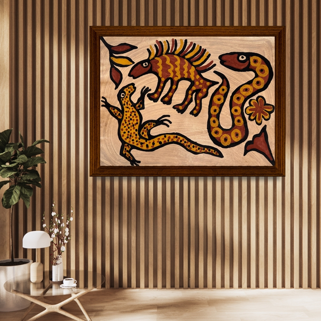 The artwork is a testament to coexistence and energy within the natural world. The intricate detailing, painted with natural pigments, reflects both movement and stillness, as if the forest itself breathes through the creatures it shelters. Each symbol and contour pays homage to the wisdom of the land and the interconnected spirit of all living beings.