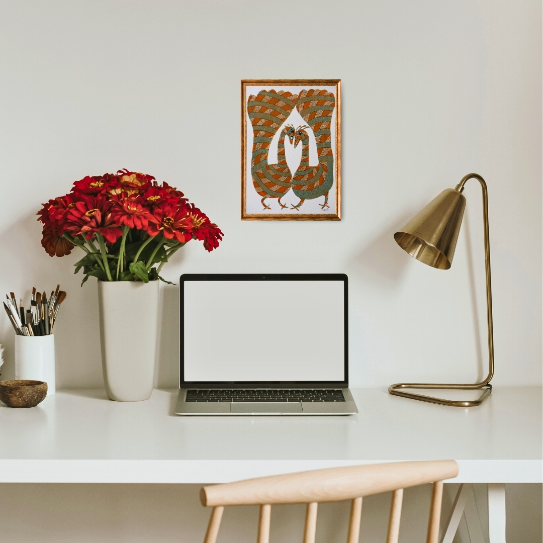 "The painting 'The Whispers of Togetherness'" by Ramesh Katara shows a close moment between two birds. Their beaks gently touch, creating a heart shape. The birds have feathers in earthy oranges, blues, and soft whites, decorated with patterns that blend together. This combination symbolises a strong emotional and spiritual bond. Their wide tails form a protective arch around them, giving a sense of unity and safety. This painting shows love as a quiet understanding. It illustrates two beings living peacefully together in harmony with nature. It is a visual poem about trust, affection, and shared connection."