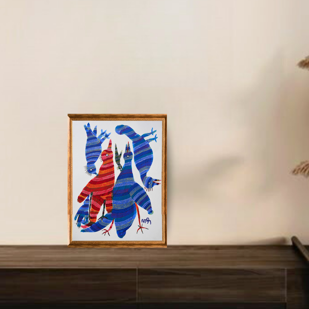 In this captivating Bhil painting titled ‘The Gathering of Birds, ’ acclaimed tribal artist Lado Bai brings to life the vibrant energy of birds soaring together in harmony. Each bird is rendered with swift, fluid brushstrokes and bright, vivid hues that capture a sense of freedom and movement, almost like a dance in the sky. The interplay of bold dot patterns, dynamic lines, and radiant colour fields evokes the wild beauty of nature and the deep, symbolic unity found in collective flight. The painting radiates warmth, rhythm, and vitality, inviting viewers into the peaceful, cyclical flow of life in the wild. One bird, painted in striking red and orange, stands out amidst the rich blues, creating a focal point that gives the composition balance and emotional contrast.