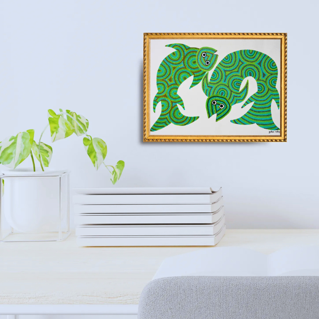 Elegant Depiction of Aquatic Life – The two graceful fish in bright green hues showcase a celebration of nature, making this artwork serene and visually engaging.