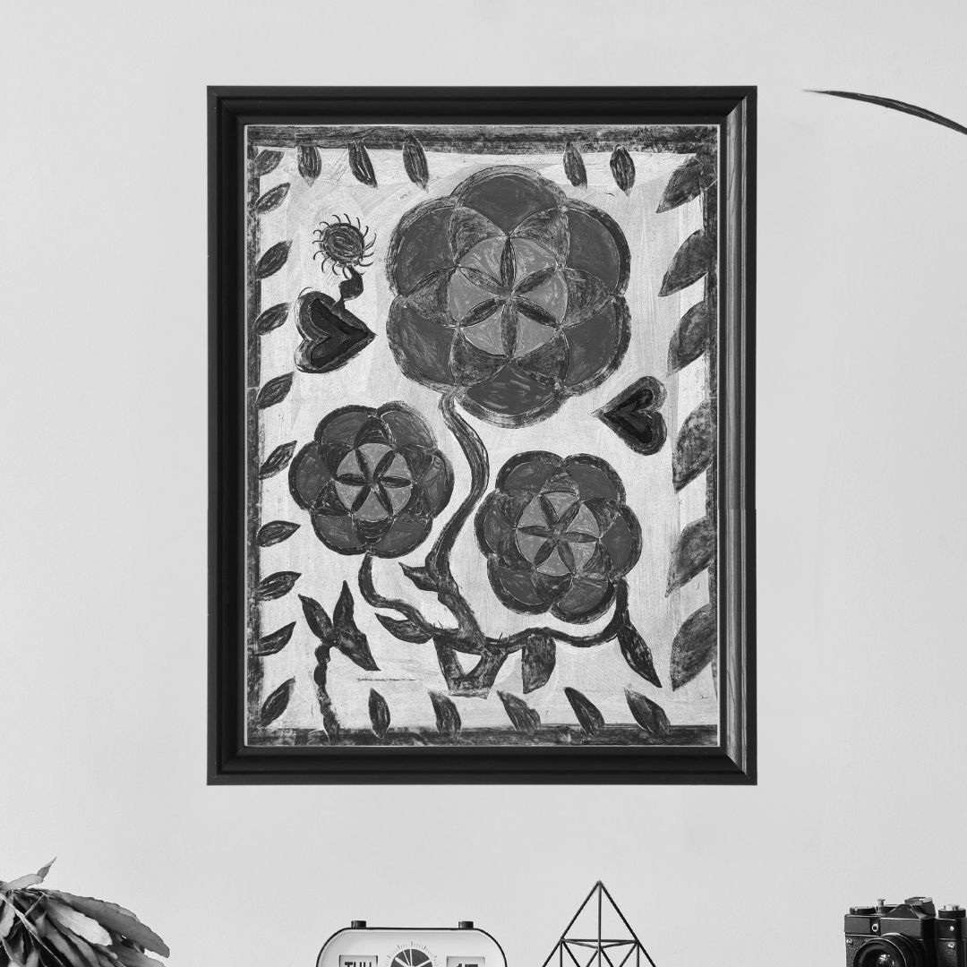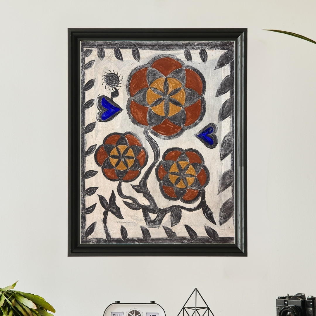 A Sunny Family' by Sunita Kumari presents a calm and balanced composition rooted in the Khovar tradition of Jharkhand. The work features three stylized flowers painted in natural tones of red, yellow, and black, their forms outlined with confident, freehand lines. The use of blue hearts and small leaf patterns along the border adds warmth and rhythm to the piece. Each element is deliberate, created using earth-based pigments that connect the work to its origins, to the walls of tribal homes where such motifs once carried blessings for newlyweds. Sunita’s painting continues that tradition on paper, preserving both its design and quiet purpose.