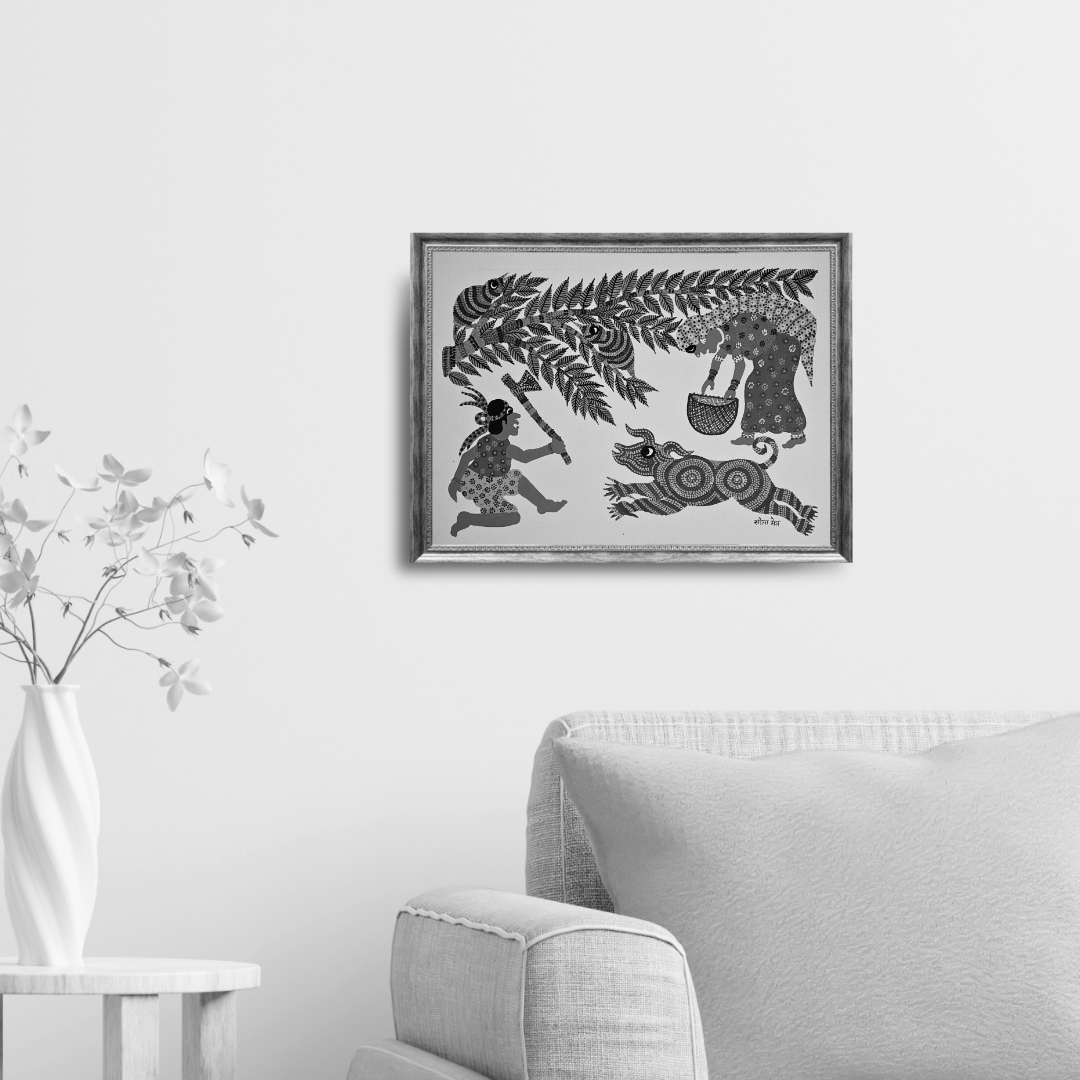 Narrative-driven art that captures the emotion of rural life gives a glance at tribal lives. Minimal yet emotionally rich composition fits both ethnic and modern interiors