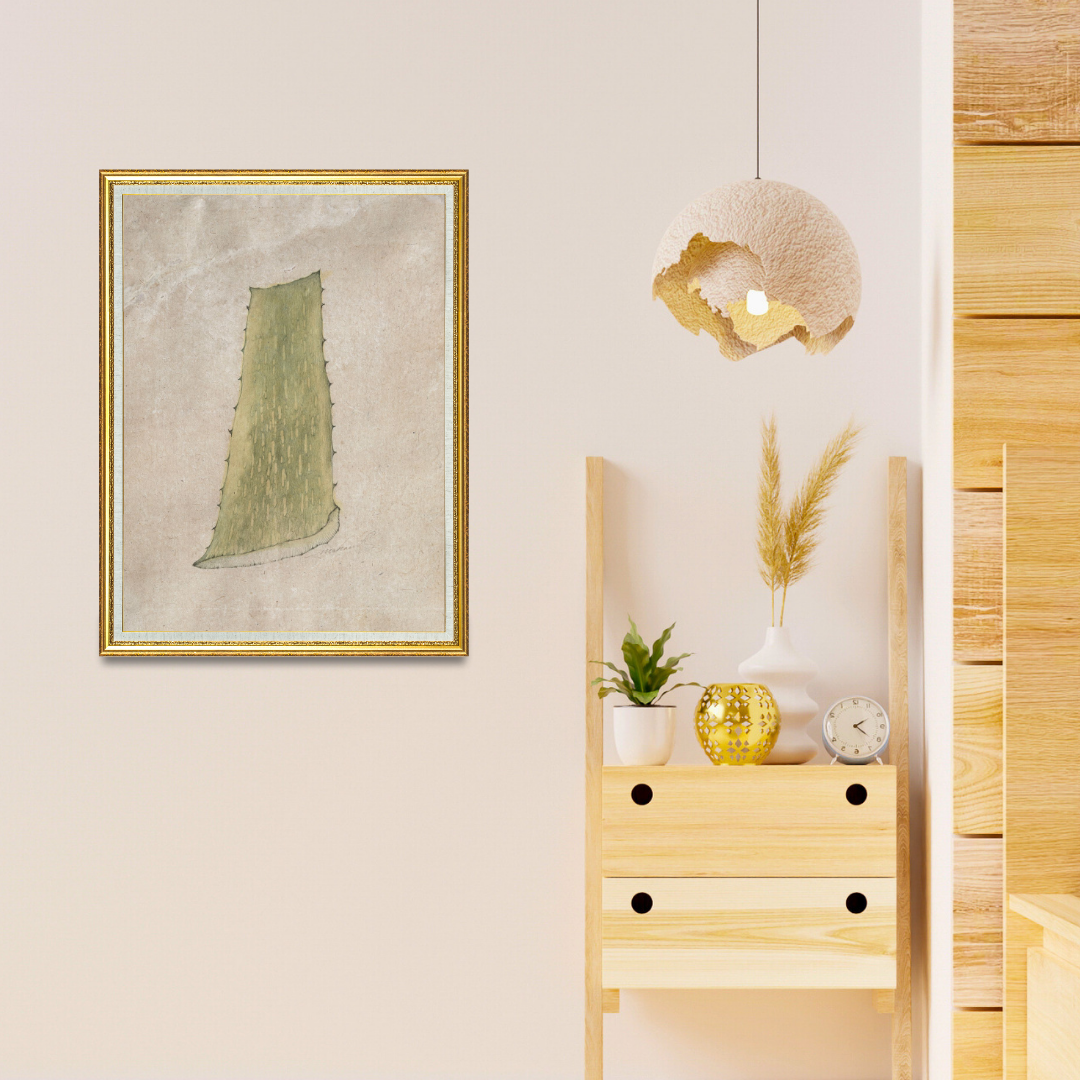 Aloe Leaf Study is as straightforward as it gets… but that’s exactly why it works. Mahaveer Swami takes a single aloe segment and treats it like a character, not just a plant slice. The soft greens shift gently from top to bottom, giving the leaf a lived-in texture… almost like you can feel the cool gel beneath the surface.