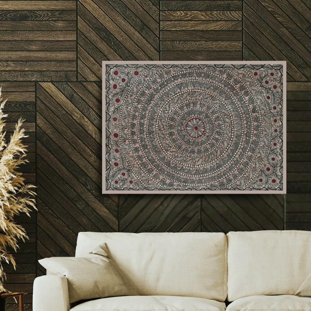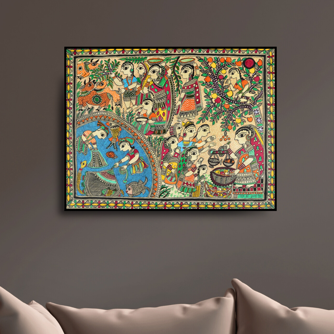 This exquisite Madhubani painting was created by Ambika Devi, a celebrated artis...