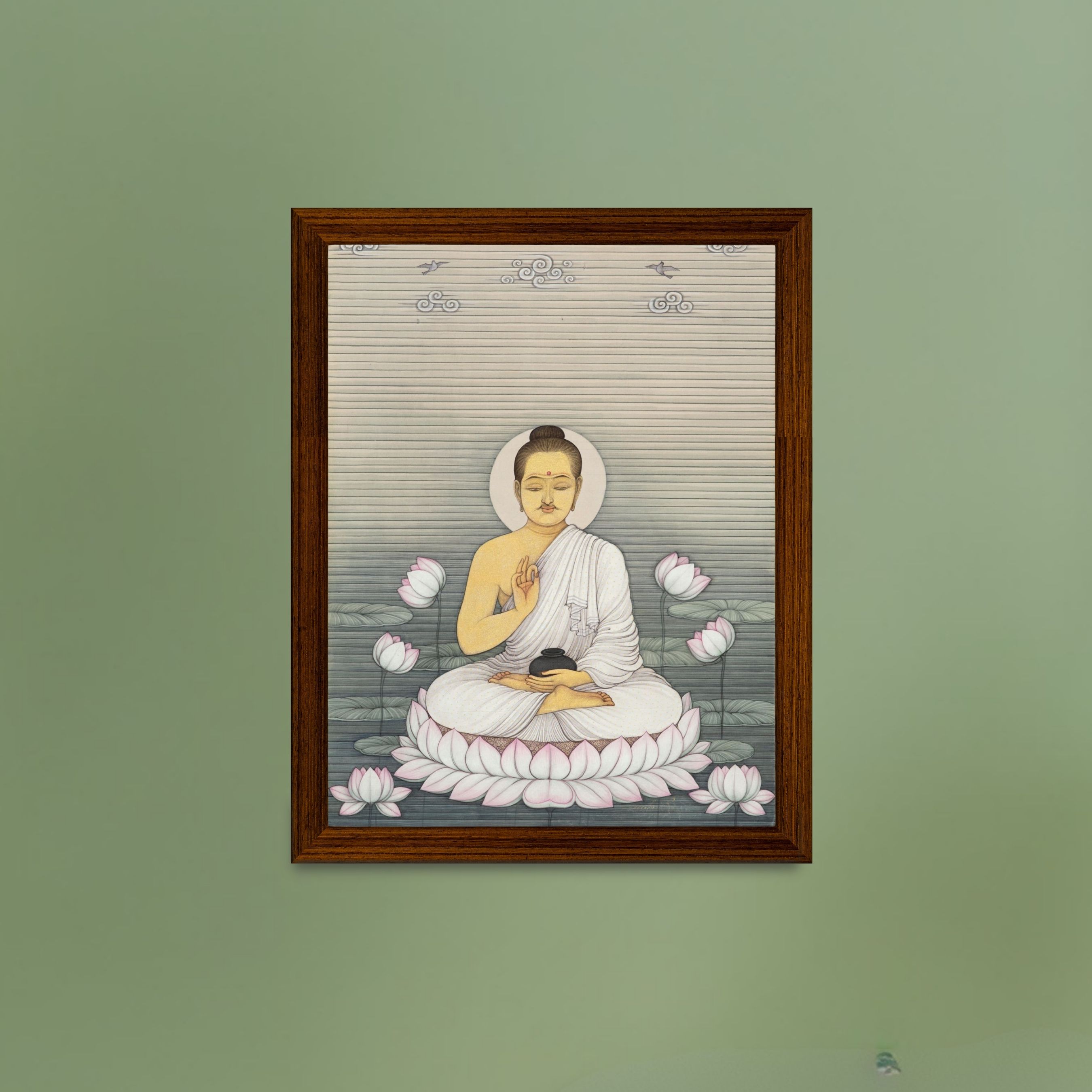 Still Waters of Enlightenment shows the Buddha seated on a blooming lotus, paint...