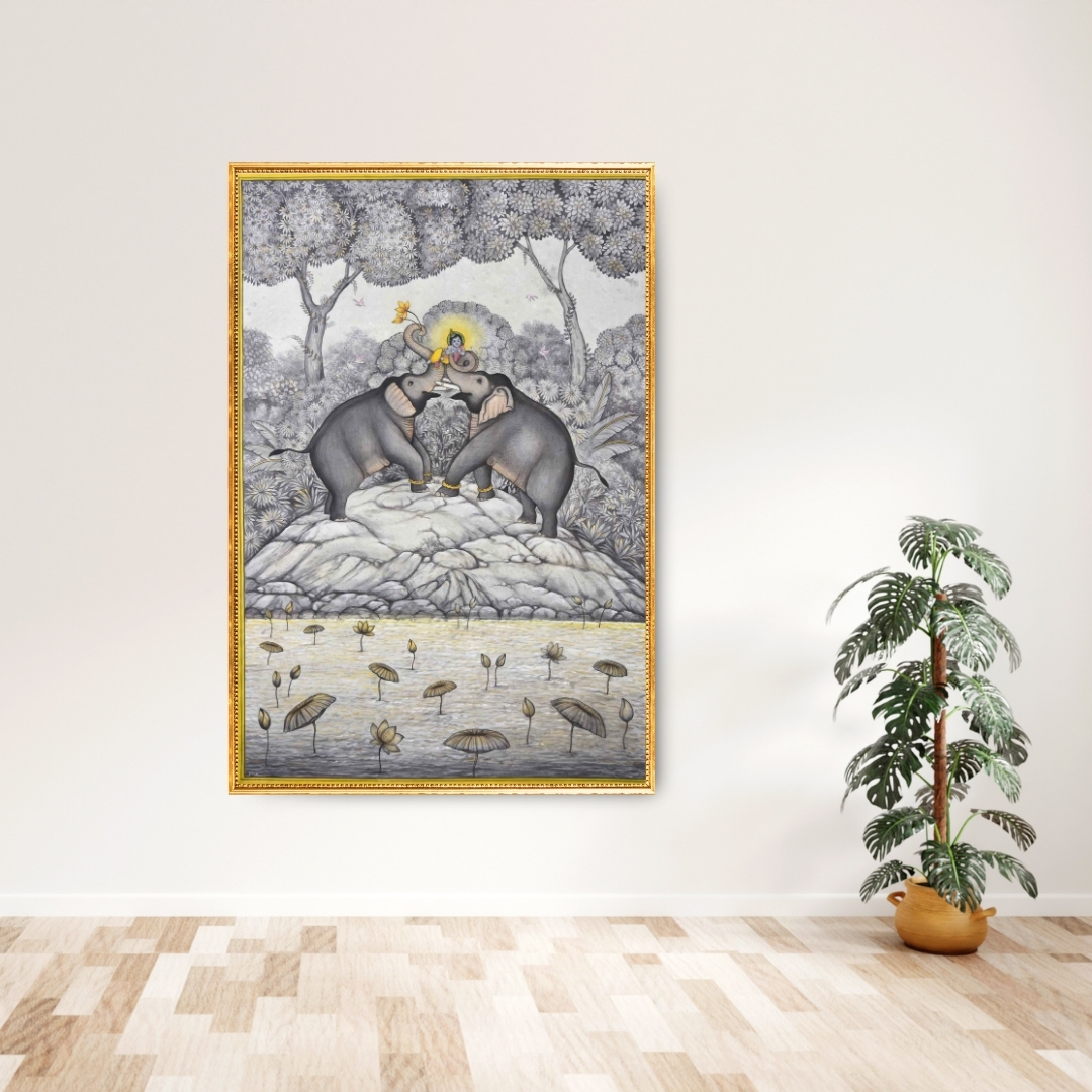 Bala Krishna with Elephants offers a gentle, playful vision of divinity. On a quiet rocky mound surrounded by a lotus-filled lake, a young Krishna sits calmly between two affectionate elephants. Each animal leans toward him slightly, their trunks raised as if in admiration or greeting. Krishna, draped in soft ornamentation and crowned with a subtle halo, becomes the smallest figure in the scene yet the one who anchors it entirely. The surrounding forest is rendered in measured detail, with trees and foliage dotted by birds that echo the quiet innocence of the moment.