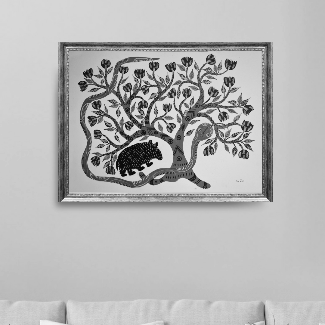 The painting "Bear and Snake Under Mahua Tree" by Hema Baiga shows the ideas of protection, strength, and the close relationship between the Baiga people and nature. In Baiga culture, the bear is seen as a guardian spirit that represents safety and courage. It is important in rituals that focus on finding protection and balance in life. The Mahua tree is sacred to the Baiga community and provides food and spiritual energy. Its presence in the painting highlights how the tribe lives in harmony with nature. The snake in the artwork symbolizes change and the cycle of life. Using detailed patterns and earthy colors, the artist brings this important scene to life, showing the connection between the Baiga people, their guardian spirits, and the natural world. This painting reminds us of the wisdom of nature and the hidden forces that protect and guide us.
