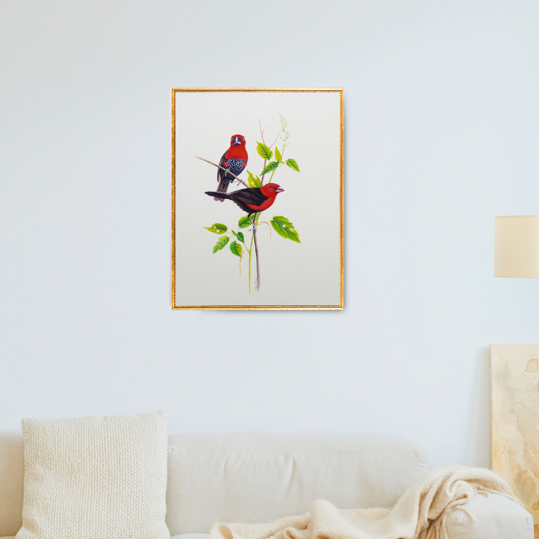 In 'Behind the Smile', Jaggu Prasad paints a pair of Red Avadavats which are the tiny, jewel-like finches known for their brilliant scarlet plumage and soft, glinting eyes. One bird faces outward, its vivid red chest catching the light, while the other perches higher, watching quietly, its patterned feathers of black and white lending rhythm to the scene. The lush green leaves and slender branches frame their forms without overwhelming them, creating a composition that feels both delicate and alive. There seems to be no overt story here, only the stillness of two creatures sharing a moment of ease, yet the title hints at a hidden meaning. What could it be?