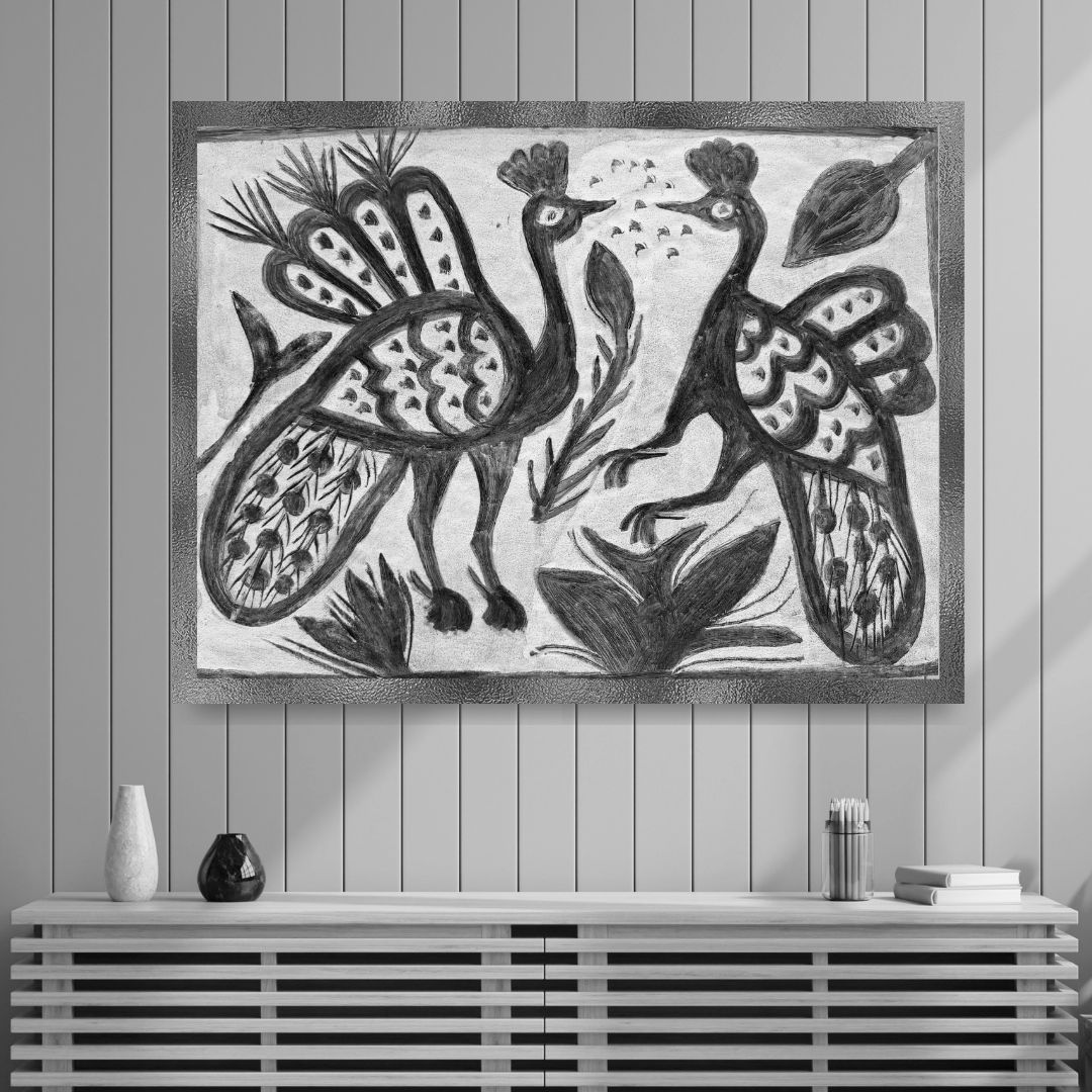 Created in 2015, this Khovar painting, Dance of the Peacocks by Rudan Devi presents a graceful pair of peacocks feeding amid stylized flora. Rudan Devi’s black pigment work balances symmetry and motion, echoing the harmony of nature and partnership. The delicate strokes and repetitive motifs evoke ritual wall designs once painted for weddings, symbols of love, beauty, and renewal.