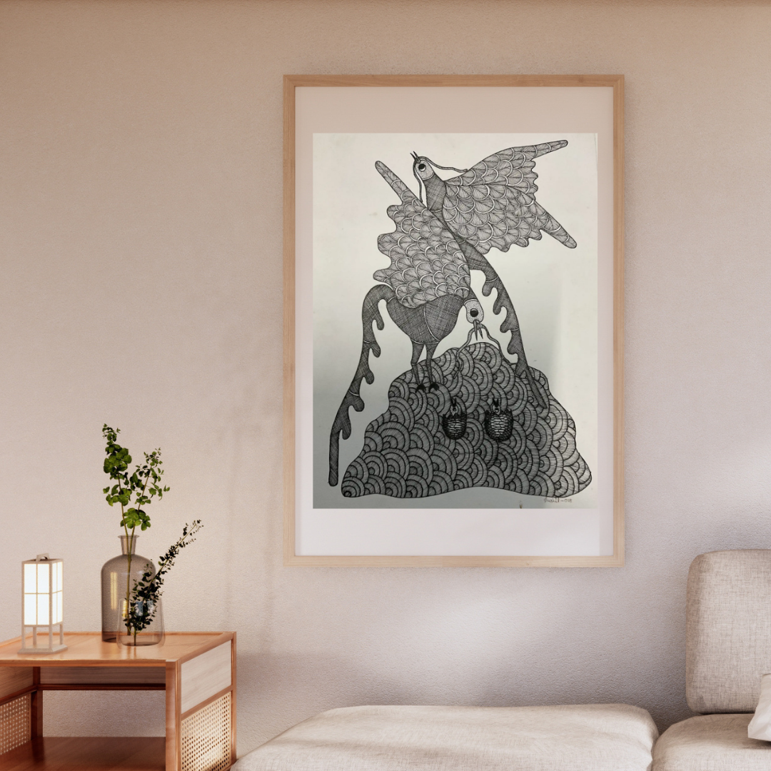 To care for your Gond painting, keep it in a cool, dry place, away from direct sunlight and moisture. Frame it under UV-protective glass, avoid handling, and gently dust it with a soft brush or cloth.