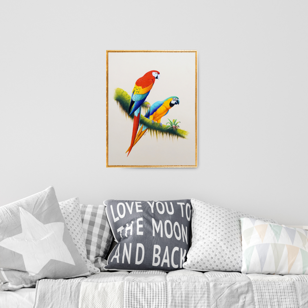 There’s a certain glow in “Forest Jewels” that feels like sunlight filtered through the leaves of a tree. The macaws here are rendered with such minute attention that even the texture of their beaks and claws seem tangible. Jaggu Prasad paints them not as static subjects, but as living jewels — vibrant, elusive, and full of character. Their mutual gaze carries both affection and alertness, echoing the timeless rhythm of the forest they inhabit. The painting’s title gives these colourful and radiant birds the status of a jewel. Perfectly articulating how they enhance and act as decorative elements to the dark and green-brown consistency of the woods.