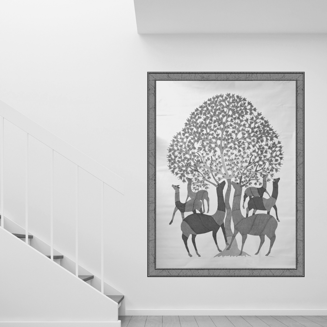A Symbol of Peace and Presence – The deer, often seen as forest guardians in Gond tradition, stand grounded yet graceful, embodying alertness, unity, and protection.