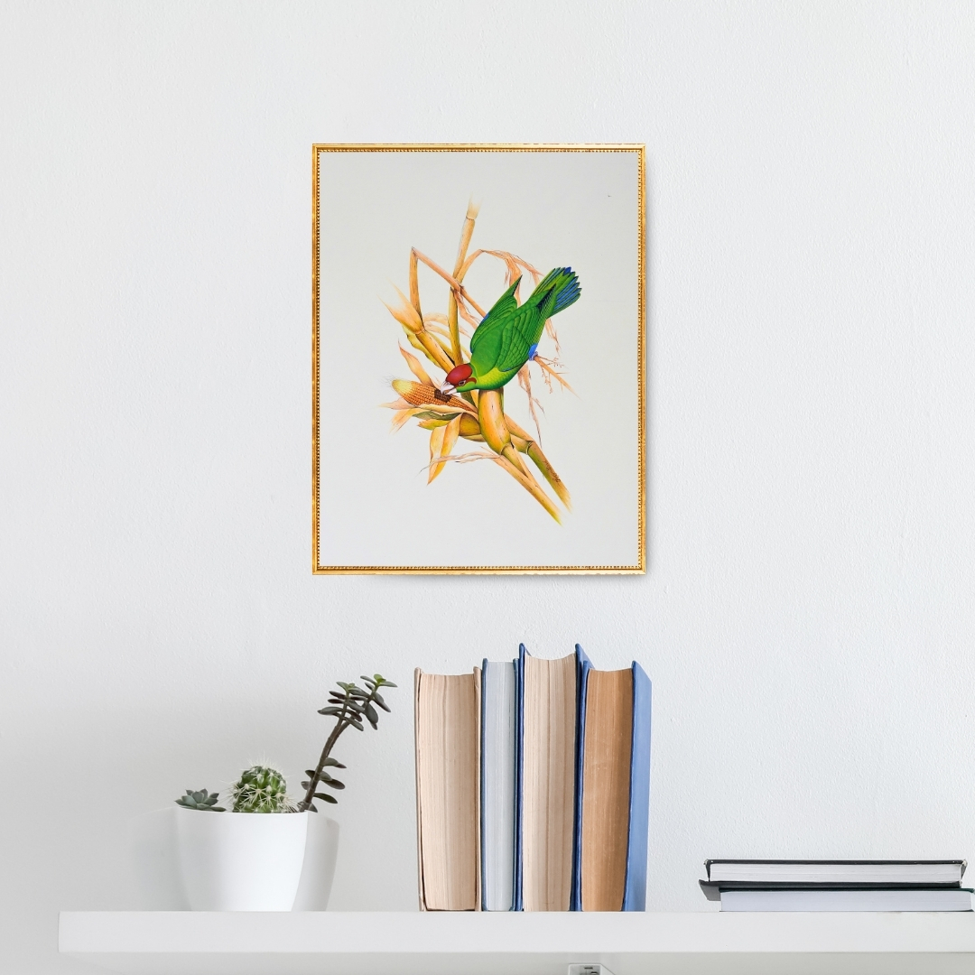 Harvest Song by Jaggu Prasad captures a green bird resting among corn stalks, its vibrant feathers contrasting against the soft golds of the harvest. The scene feels both still and full of life, a quiet reminder of the bond between nature and sustenance. The artist’s attention to form and texture gives each detail a sense of touch and truth.