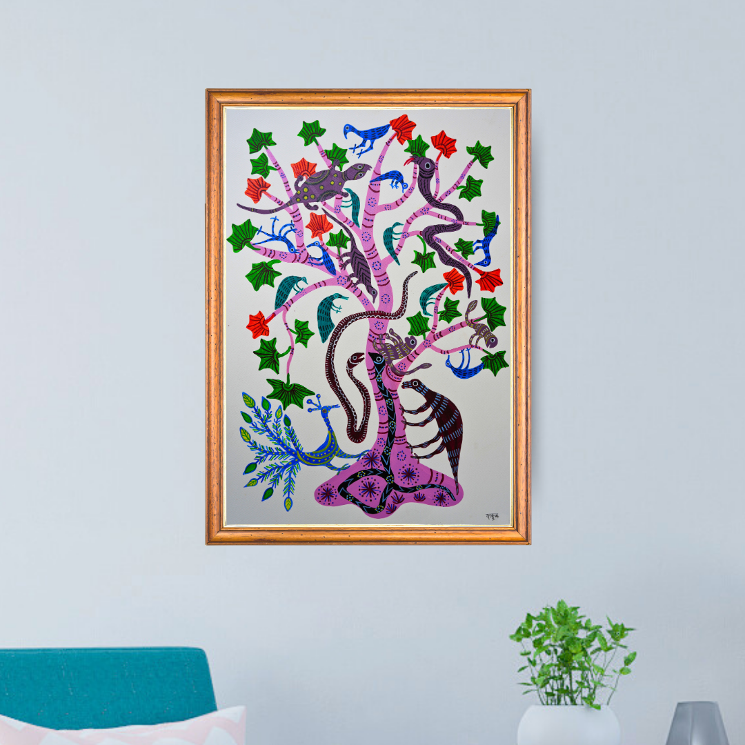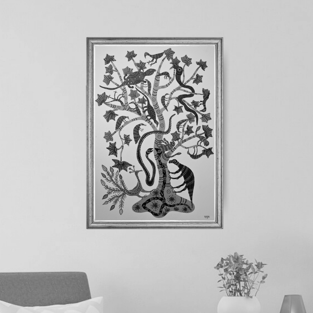 The Kullu tree holds immense cultural and spiritual significance in Baiga art and mythology. Deeply rooted in their worldview, the Kullu tree is often seen as a sacred symbol that connects the heavens, the earth, and the underworld. It highlights the interconnectedness of all living beings and the environment. In Baiga mythology, this tree is revered for its life-giving properties, serving as a sanctuary for all creatures and a representation of fertility, sustenance, and the cycle of life. Its depiction as the central element in the artwork emphasizes its importance as a life force and a guardian of balance in nature. The artist's choice to position the Kullu tree prominently might reflect an intention to celebrate its sacredness while visually narrating its mythological role within Baiga cosmology, where nature and spirituality are inseparable.