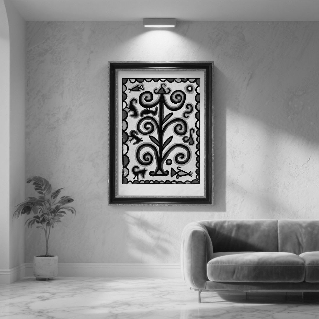 Living Roots' by Parwati Devi is a quiet celebration of growth, balance, and connection. The painting rises from the earth, each spiral branch unfurling with a sense of movement and renewal. Using simple, natural colours, Parwati Devi transforms clay pigments into symbols of life’s continuity, echoing the ancient belief that all beings are part of one living rhythm. Around the tree, animal and bird forms appear like guardians of nature, each line alive with warmth and instinct.