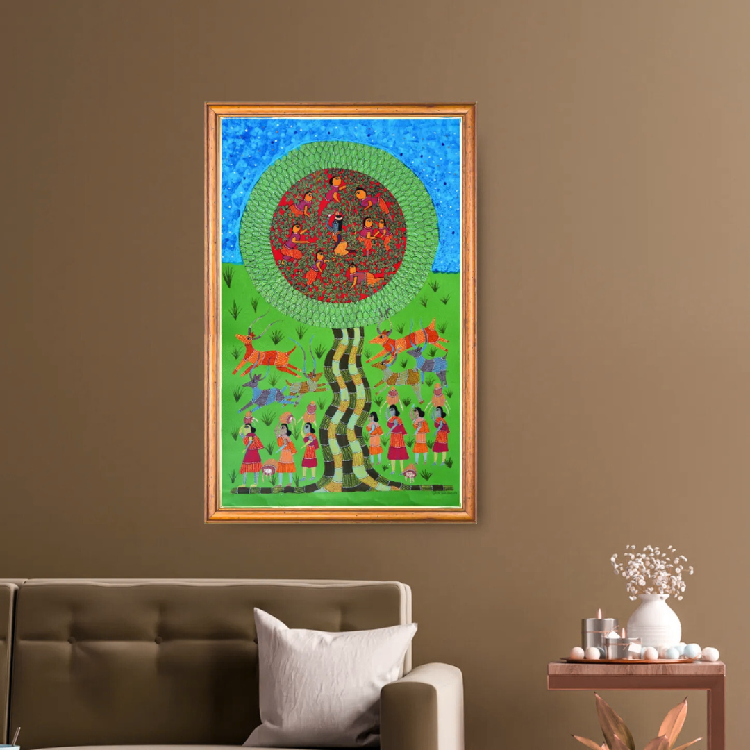 In this vibrant Gond art piece by Suresh Dhurve, the playful and enchanting scene of Mischievous Krishna unfolds near the riverbank. At the heart of the painting, Lord Krishna is on the top of the tree surrounded by his friends, mischievously throwing stones at the Gopis who carry pots of buttermilk. The lively tree, painted in rich, vivid colors, adds energy to the scene while animals surround the base, creating a harmonious connection between nature and the divine. With intricate details and meticulous patterns, Dhurve brings this moment to life, capturing the joyous spirit of the legend with an infusion of color, life, and movement. This beautiful painting radiates the playful essence of Krishna’s mischievous nature and the vibrant world he inhabits.