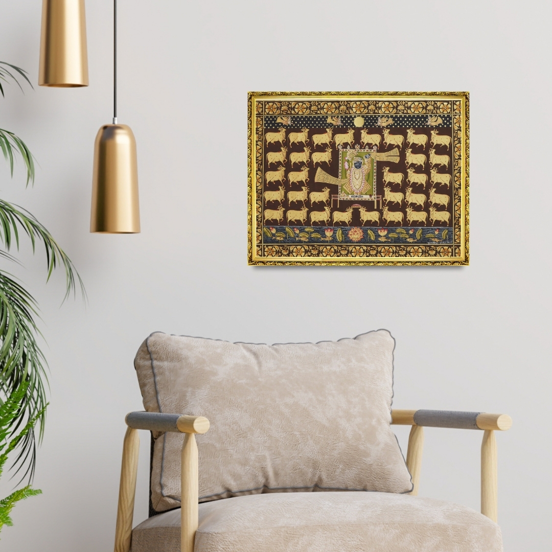 Rendered in natural stone colours on fabric, the artwork reflects the meticulous detailing and heritage methods characteristic of the Pichwai tradition. It captures the rustic beauty of pastoral life while honouring the symbolism of Krishna as the protector of cows. The composition feels timeless, contemplative, and deeply rooted in devotional storytelling.