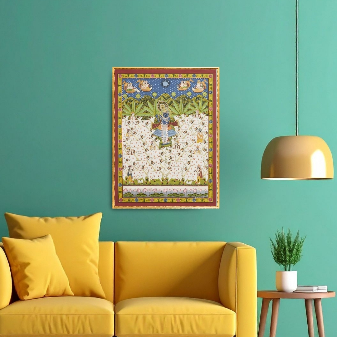 Painted in natural stone colours on fabric, the artwork brings out the meticulous detailing characteristic of Pichwai tradition. Every cow, leaf and celestial form is rendered with care, reflecting the artist’s deep connection to this sacred visual language. The rhythmic arrangement and luminous palette make the painting an uplifting presence in any space.