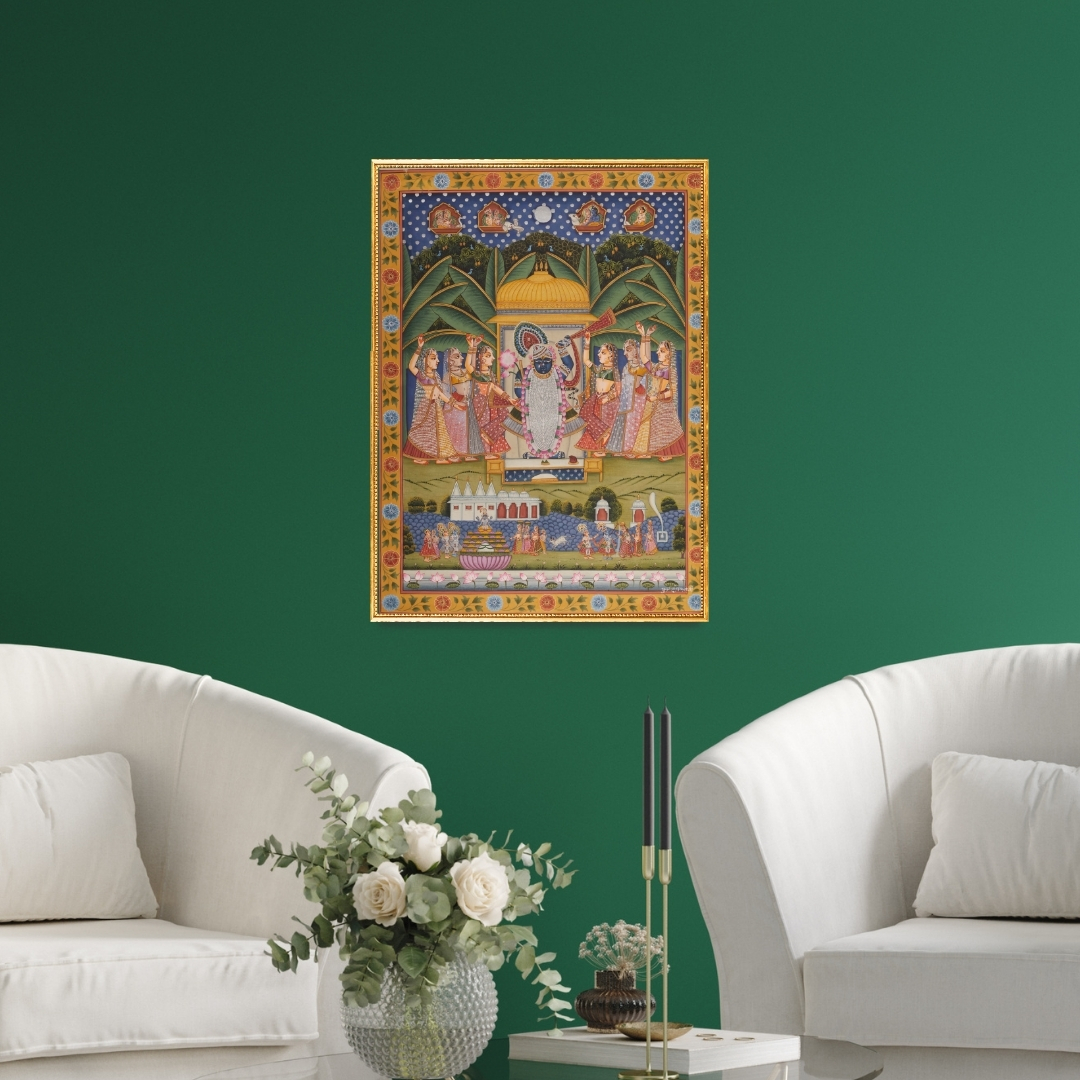 - Intricate detailing reflects the heritage of traditional Pichwai painting.