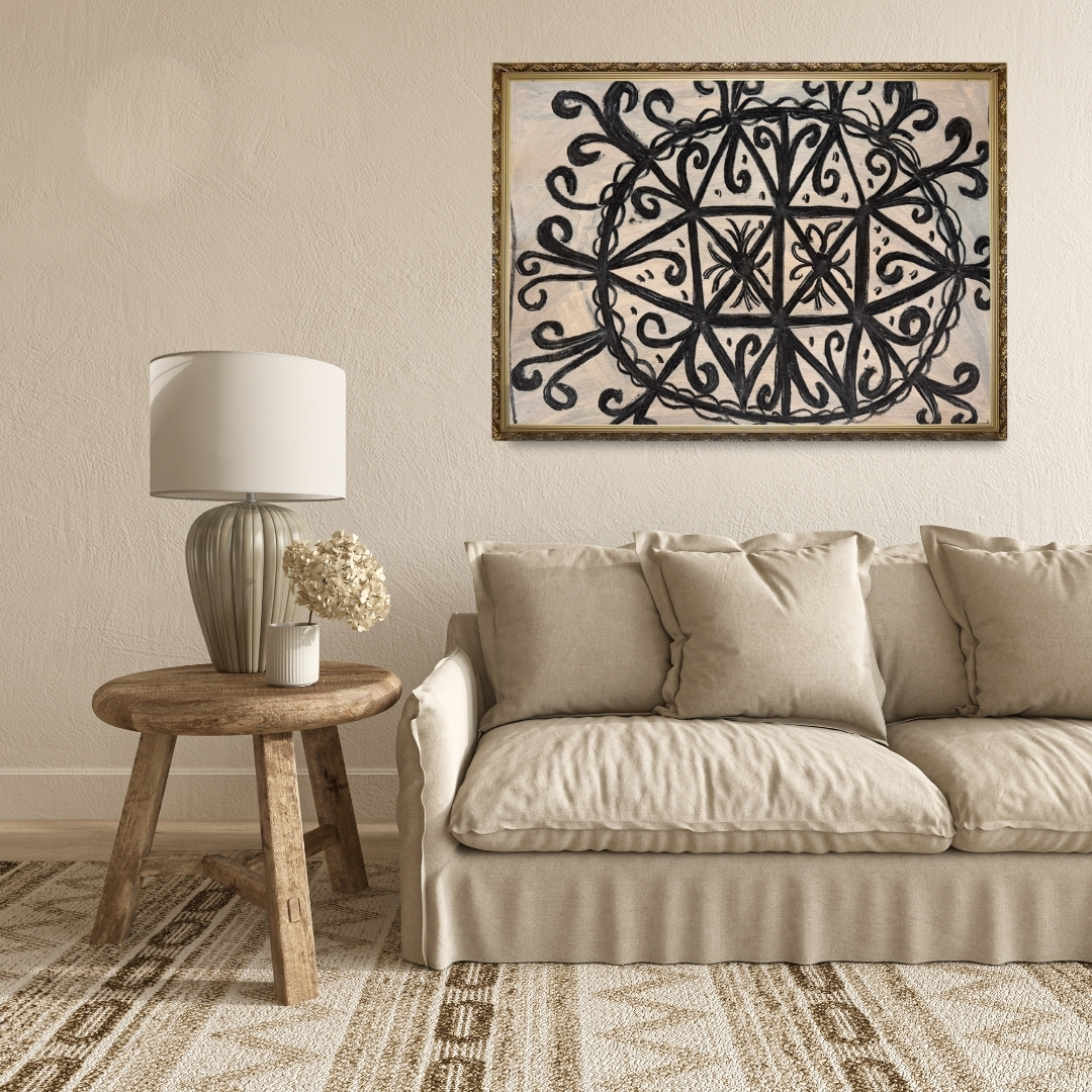 Shaadi Chowk I by Rudan Devi captures the sacred geometry and ritual symbolism central to Khovar art traditions. This work represents the ceremonial chowk, a sacred square or mandala-like design drawn during tribal weddings to bless the union of the couple. The painting’s concentric patterns, anchored by fluid floral and spiral motifs, symbolize fertility, protection, and the cyclical nature of life.