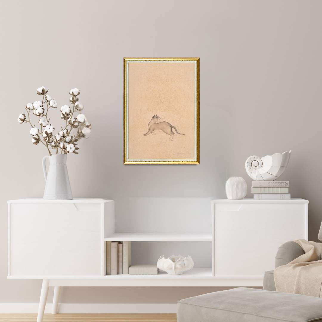 Shadow in Motion focuses on a lone cat captured mid stride with a quiet, almost instinctive grace. Mahaveer Swami paints the form with delicate black ink, letting soft gradients shape the muscles, the lifted paw, and the gentle curve of the tail. The cat holds its catch with a natural, unhurried confidence… a moment frozen without drama, only observation.