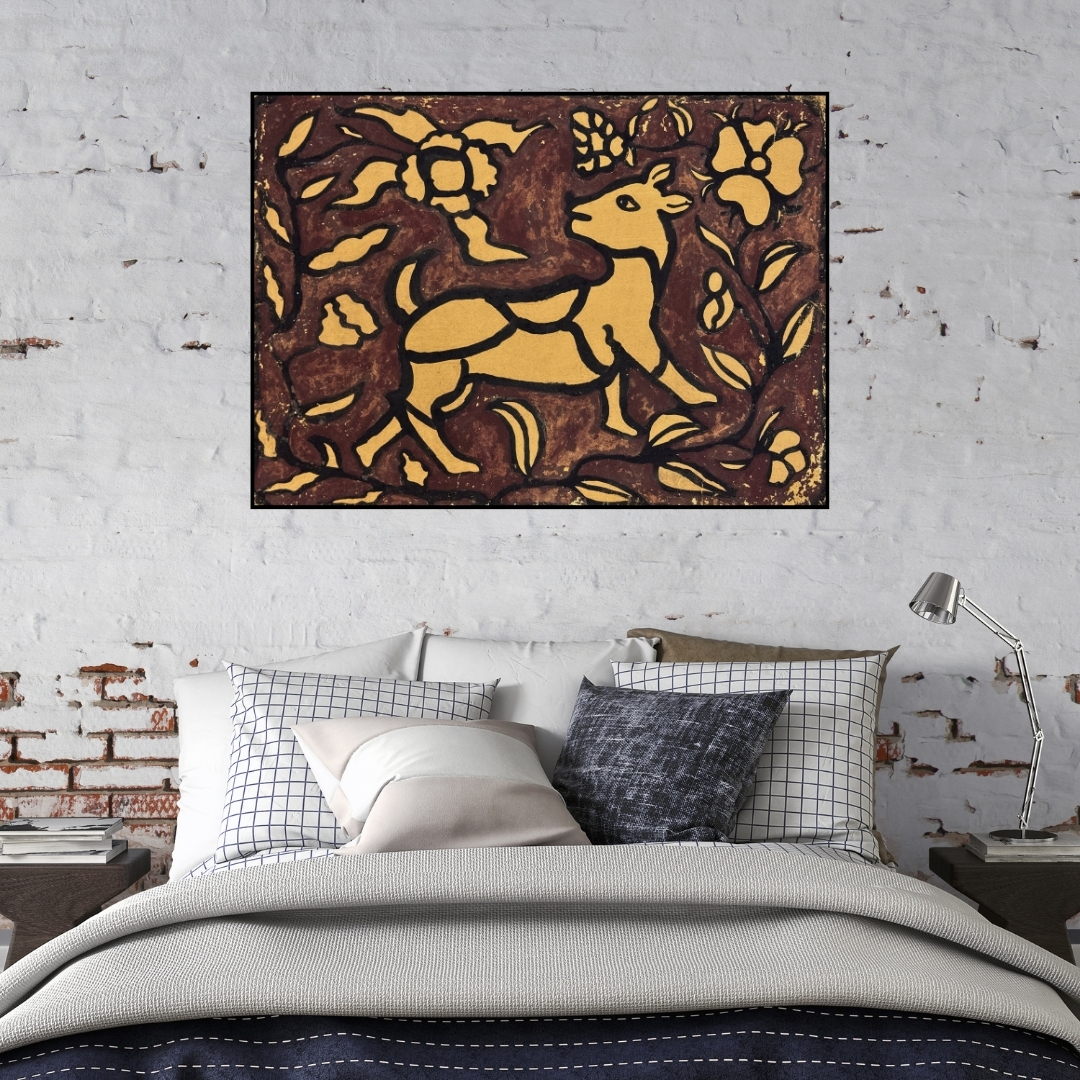 "Grazing in Bloom by Philomina Tirkey is a Sohrai painting that captures a deer-like creature moving through a field of bold, stylized flowers. Philomina Tirkey’s lines are confident and uncomplicated, turning natural forms into patterns of rhythm and balance. The earthy yellow background contrasts the strong black outlines, creating an image that feels both rooted in the soil and alive with motion. This work reflects Sohrai’s deep connection to fertility and the seasonal renewal of life, where every animal and plant is part of one continuous rhythm of the land.