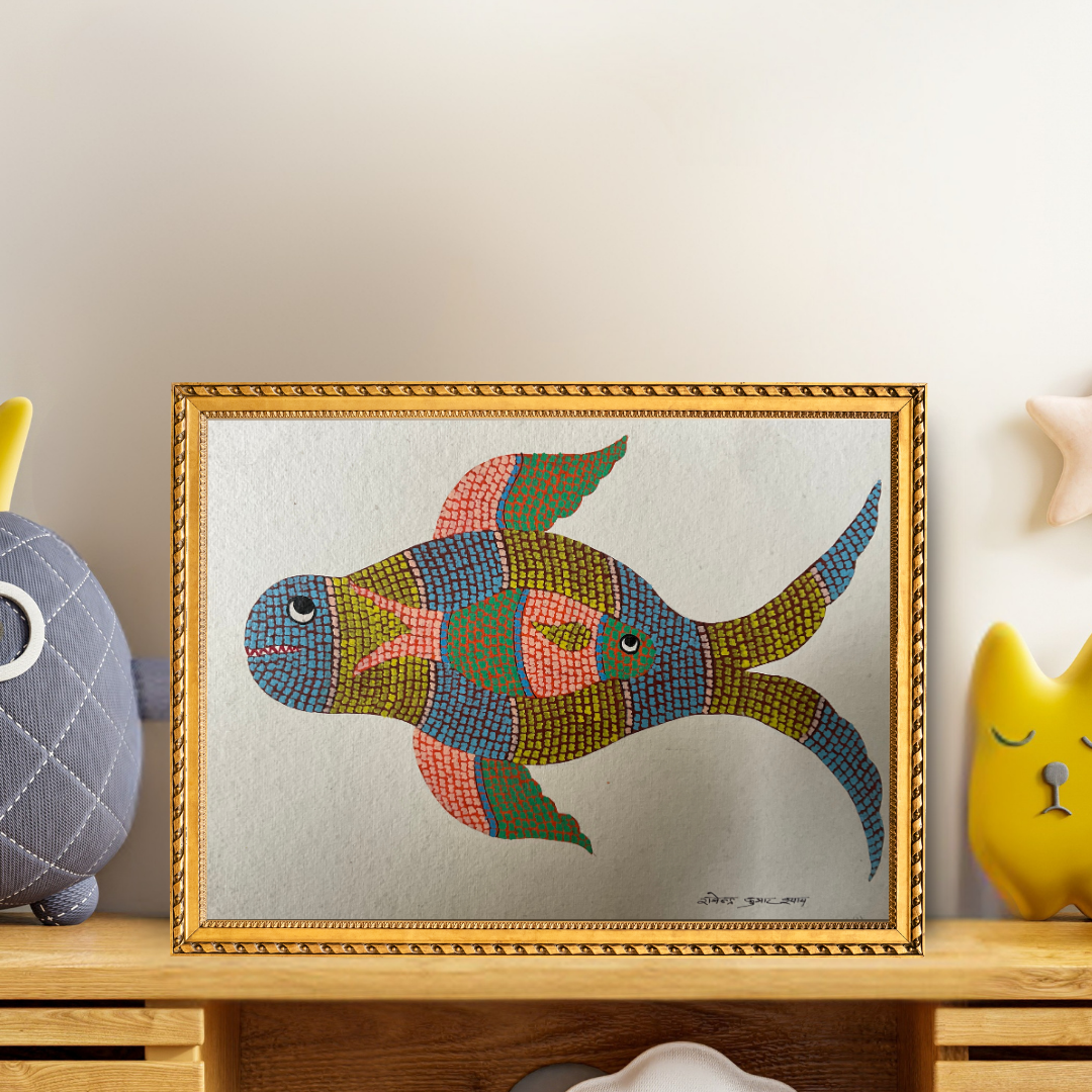 In this painting, ‘Life Within Life’, the artist has portrayed a scene of a large predatory fish consuming a smaller fish, making him its prey, which is a part of nature’s cycle. He beautifully portrays the large form of fish in blue, green and a bit of orange in his fins, while the prey of this fish is painted in the contrast of only orange and green. The artist brilliantly portrays the fear in the eyes of the tiny fish with big, bold eyes, while the sharp teeth and looking upwards for another prey portray the bigger fishmaking him the predator. Overall, this painting tells a small story from the daily lives of underwater through the artist's mastery of portraying it in a simple manner.