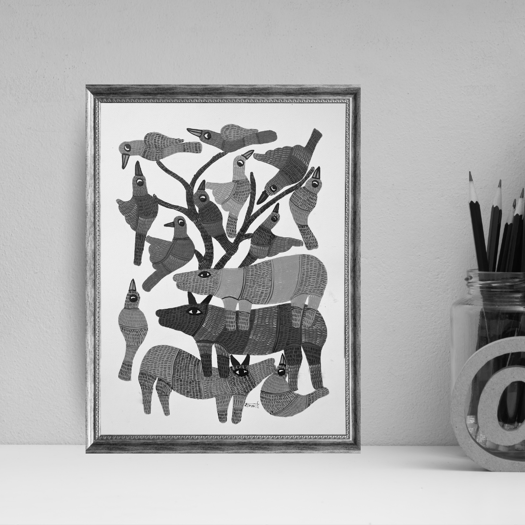 Stacked playfully and sharing space in peace, the animals defy natural hierarchies, echoing the Gond belief in co-existence and equality among all living beings. The tree, hosting a flock of birds in various poses, forms the heart of the composition, an emblem of shelter, unity, and interdependence. With its bright palette and storytelling charm, this artwork invites viewers into the artist’s world, where nature thrives through companionship rather than competition. Perfect for adding a splash of culture and warmth to any space, this painting is ideal for cozy corners, artistic walls, or thoughtful gifting. Rambai’s work continues to reflect the timeless Gond tradition of honouring life through art.