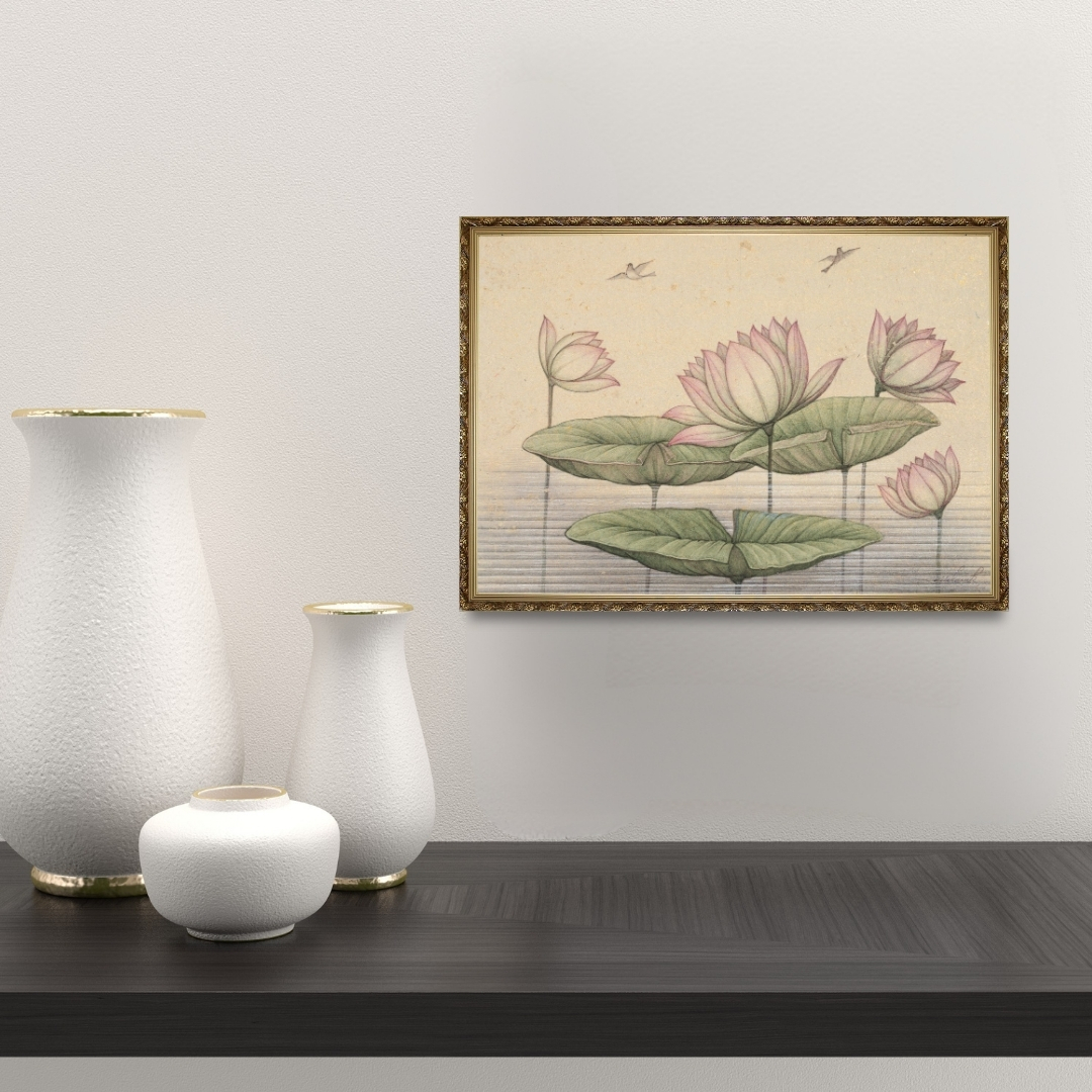 Whispers of the Lotus Pond brings a quiet, breath-soft stillness to life as delicate pink lotuses rise gently from rippled water. Mahaveer Swami shapes each petal with patient, graceful strokes, letting the soft gradients of natural pigments create a sense of unfolding calm. The layered handmade paper adds a subtle texture that makes every leaf and bloom feel tender and alive.