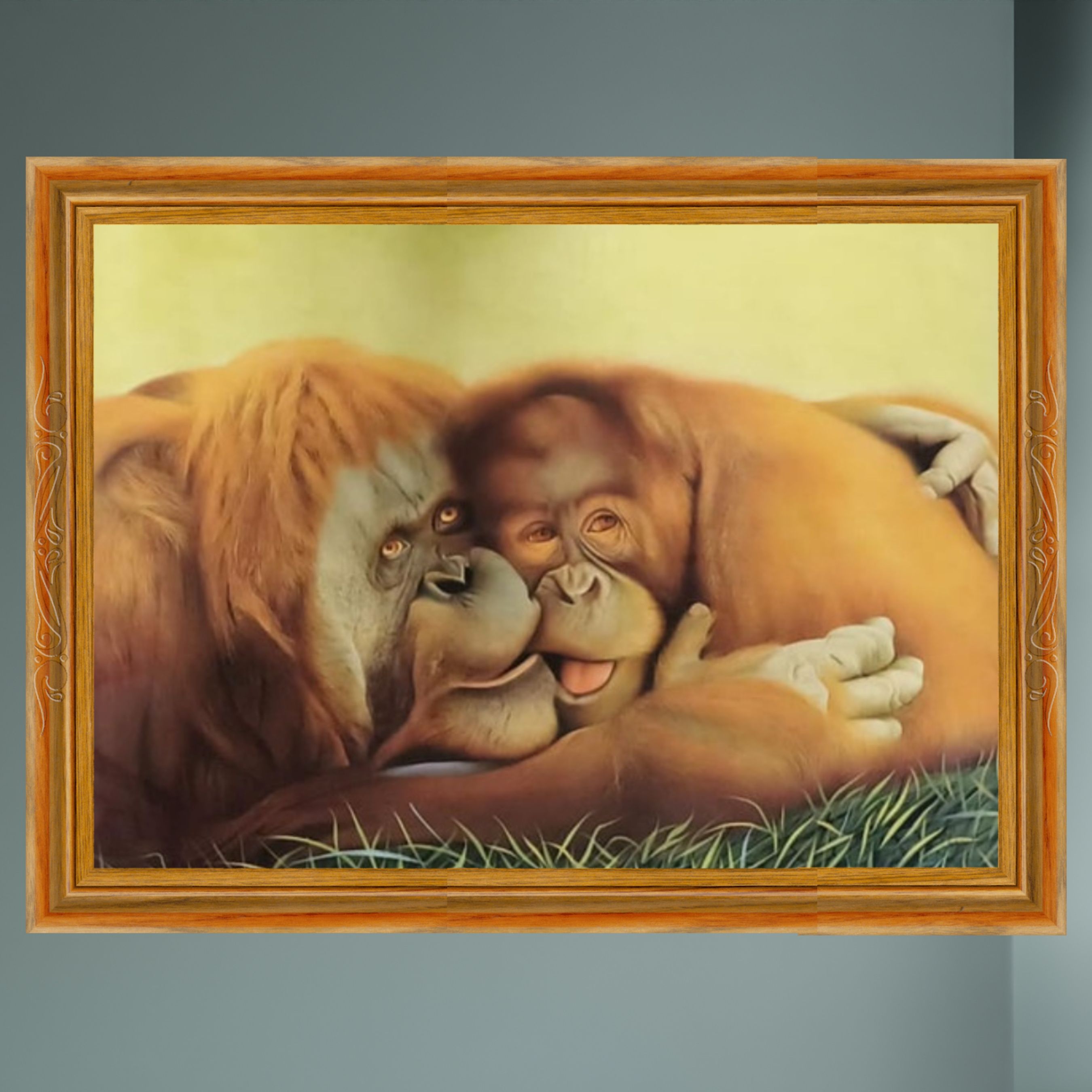 Two stout, powerful figures stand one above the other in this handmade painting ...