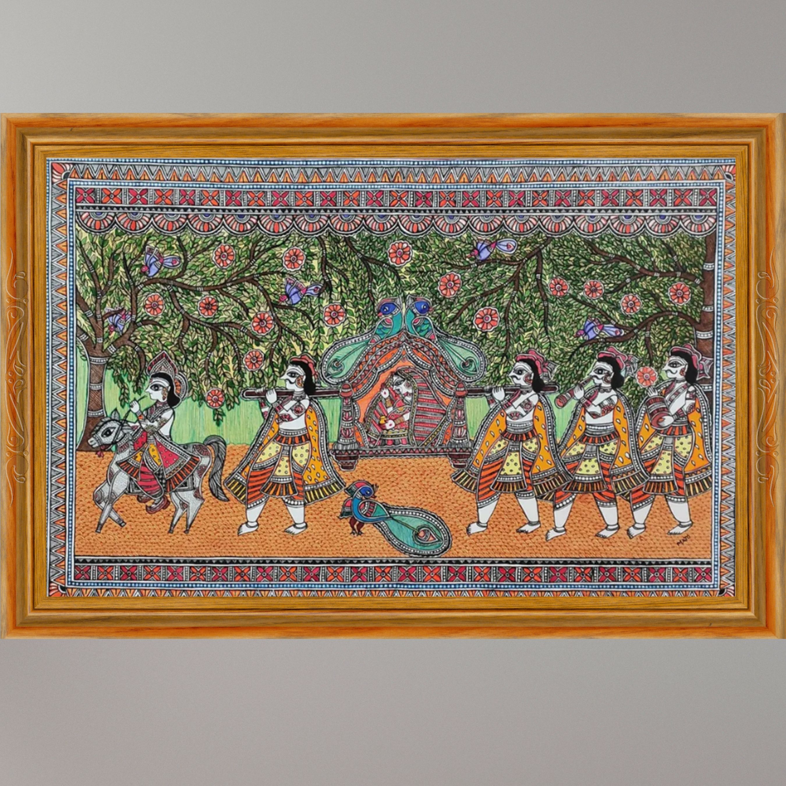 This vibrant Madhubani painting titled “Doli-Kahaar” beautifully depicts a tradi...